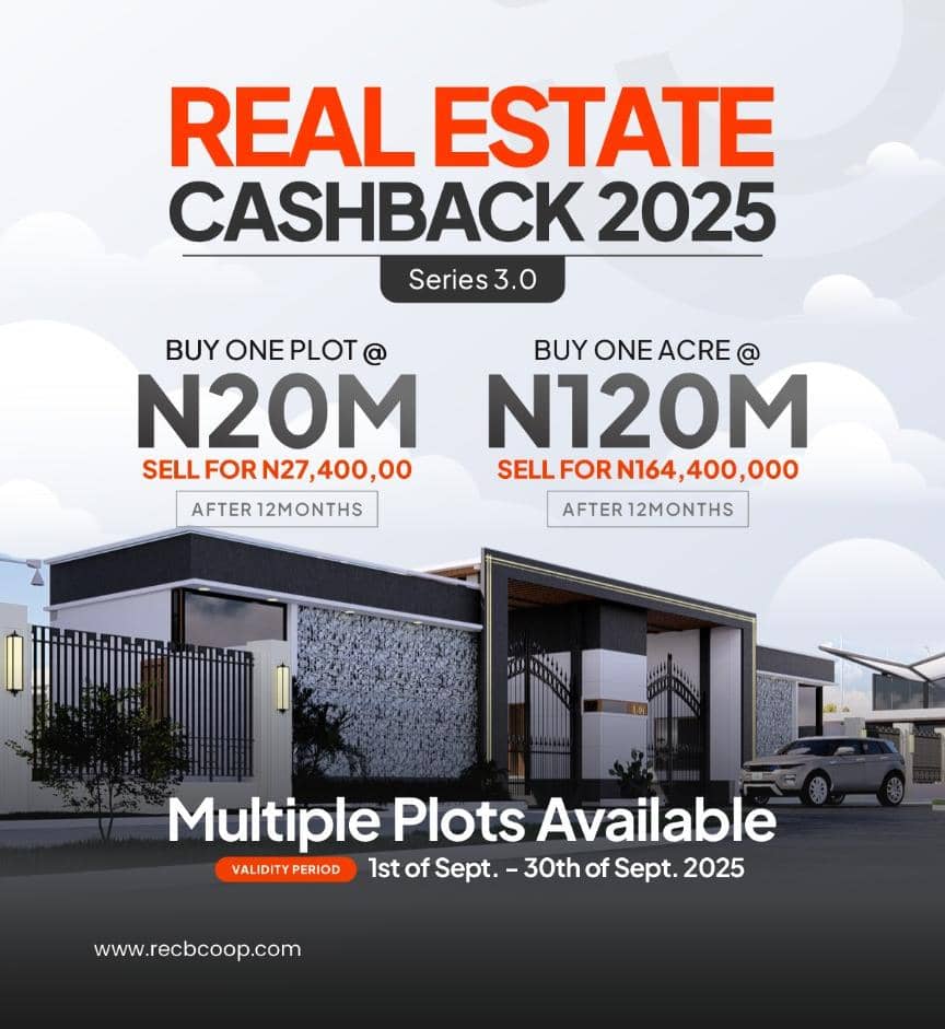Real Estate Cashback, an initiative of Real Estate CashBank Cooperative Society Limited, offers a secure and profitable way to invest in real estate in Nigeria. We provide a low-risk, high-return investment opportunity with a guaranteed 37% ROI in just 12 months.